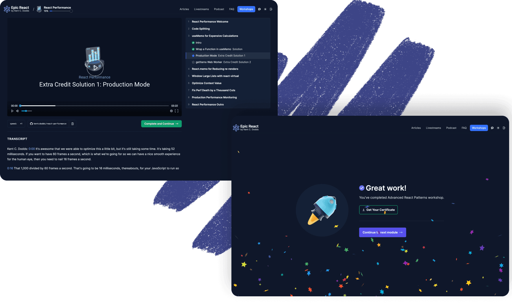 At each step of the process of building Epic React, the focus has been on creating an amazing and valuable experience for developers to help them increase their confidence, reduce overwhelm, and level up their skills in developing React applications with solid foundations.
