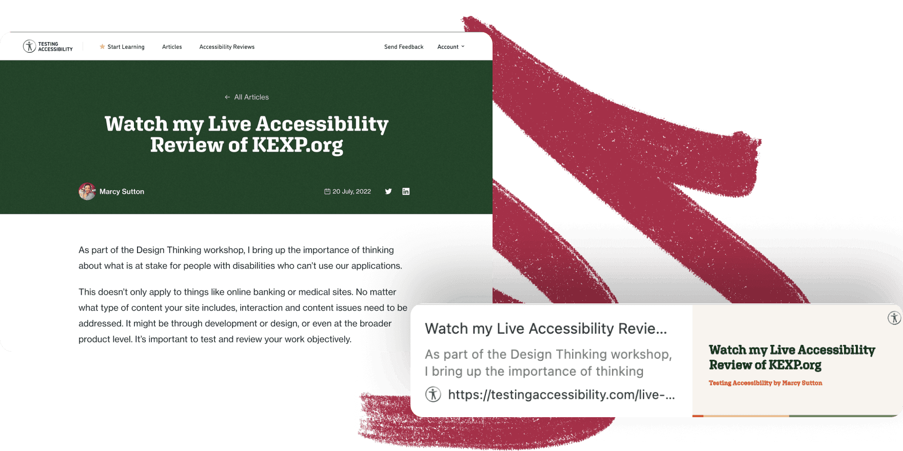 In the months leading up to the launch, Marcy wrote emails that we then published as articles on the site, helping to provide value to learners and also boosting the site’s SEO. We helped provide Marcy with ideas about what kinds of questions or topics she could tackle in an article. When Marcy found a site that had a lot of the accessibility fails she was addressing in one section of her workshop, we encouraged the idea of doing accessibility reviews to help showcase examples of accessibility fixes needed — which she enthusiastically took on.