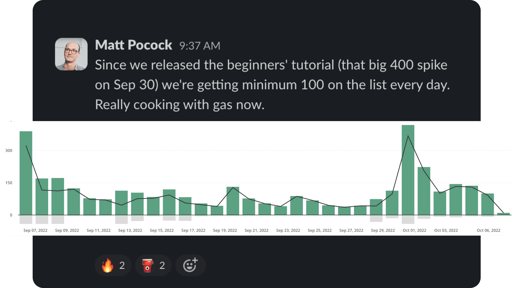 A Slack message from Matt pointing to the impact of the Beginner’s Tutorial.