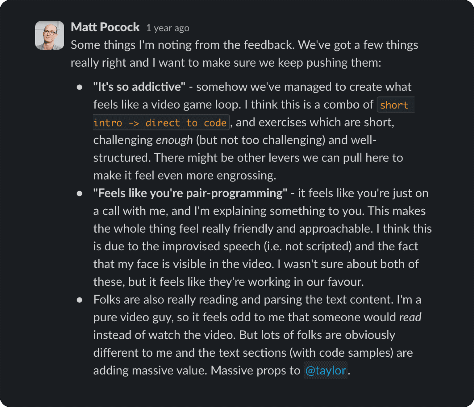 A Slack message from Matt explaining the feedback he started to receive.
